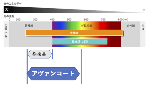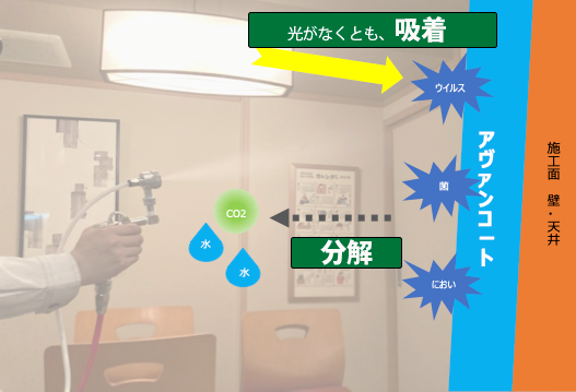 アヴァンコートは光が当たることにより、活性酸素を生み、周辺の臭い・細菌・ウィルスなどの有害物質を酸化分解し、