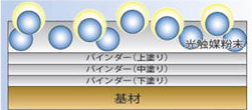 従来の光触媒は、有機物を分解するため、強力な分解力により定着させる壁などの基材そのものを分解してしまう欠点がありました。アヴァンコートは、鉄ドープ酸化チタンにアパタイト(カルシウム成分)を被覆させ、コーティング面に直接酸化チタンが触れない事で、定着面に損傷を与えず、また効果が長期に継続します