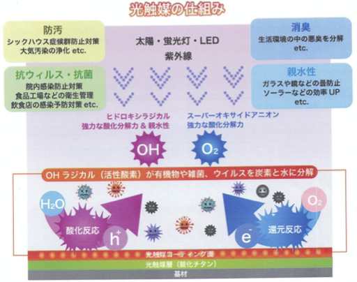 光を当てると電子と正孔が同時に発生し、酸素などと反応して活性酸素ができる。この活性酸素はオゾンよりも強い酸化力を持っていて、ウイルス・菌・有害有機化学物質や悪臭などを水や二酸化炭素などの無毒で無臭の物質に変えることができる。