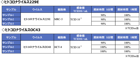 この試験では、新型コロナウイルス(SARS-CoV-2)の代替としてヒトコロナウイルス 229EおよびOC43を使用。これらのウイルスは、ASTM E35農薬・抗菌剤・代替制御剤 評議会が発表したASTMガイダンスに基づいて選択されました。